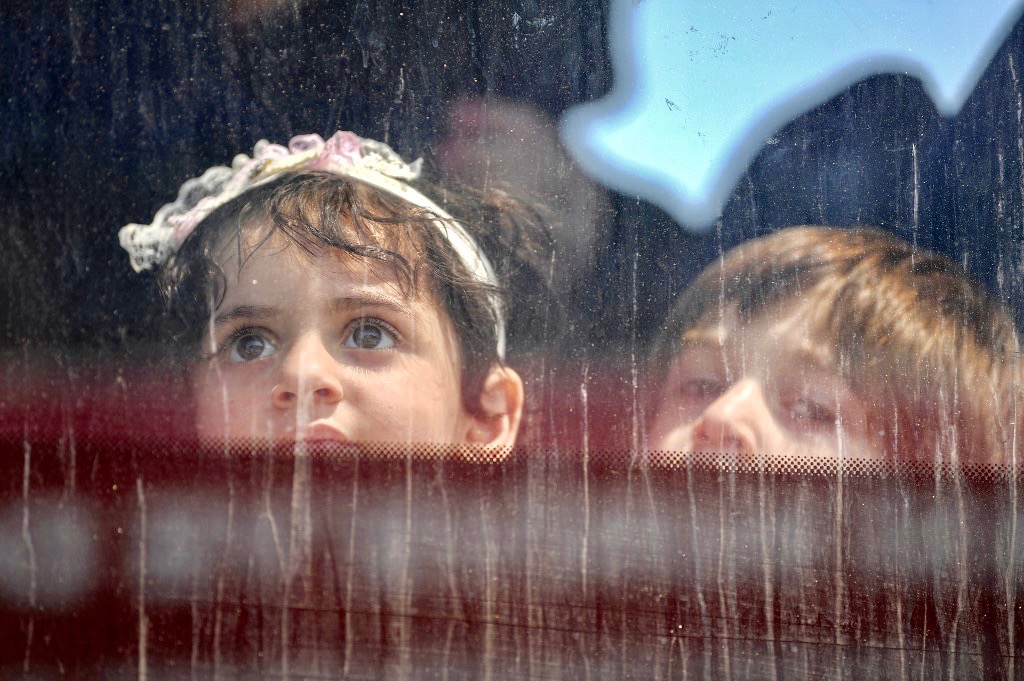 Syrian refugee children sit on a bus in Istanbul before returning to Syria earlier this year (AFP/File photo)