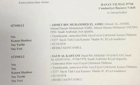 The chief prosecutor's office in Istanbul filed an application on Tuesday to obtain the warrants for the men, described in court documents as being "among the planners" of the murder.