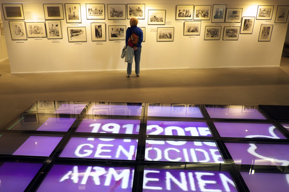 A woman looks at pictures during a French exhibition about the 1915 killings, referred to by Armenians as a genocide (AFP)