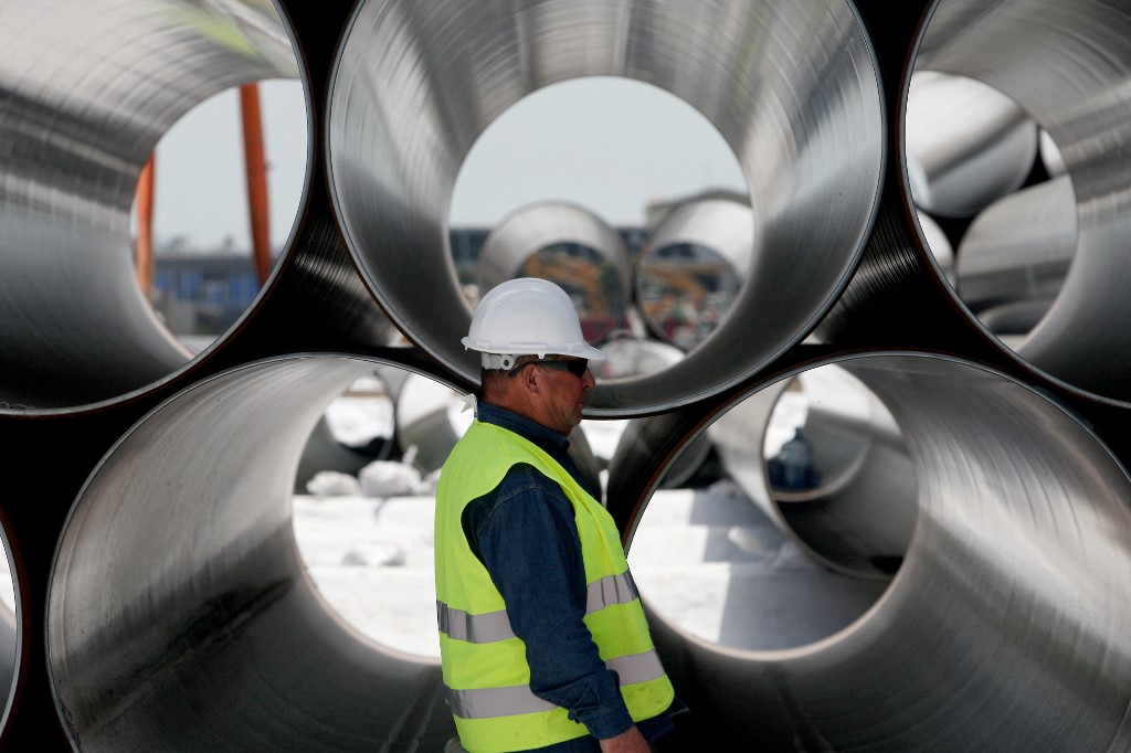 A worker stands next to newly arrived pipes for the construction of the future Trans-Adriatic Pipeline in Spitalle, near Durres on April 18, 2016, aimed to bring gas from the Caspian Sea to Europe. (AFP)