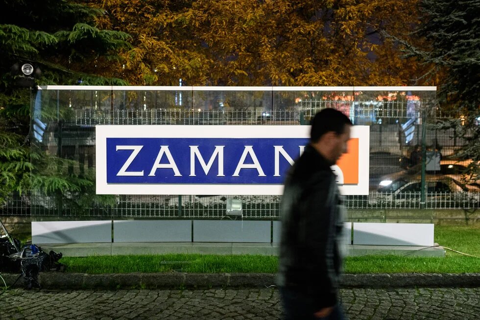 An employee walks next to the logo of the Zaman daily while police officers search the newspaper's headquarters on 12 November 2015 In istanbul (AFP)