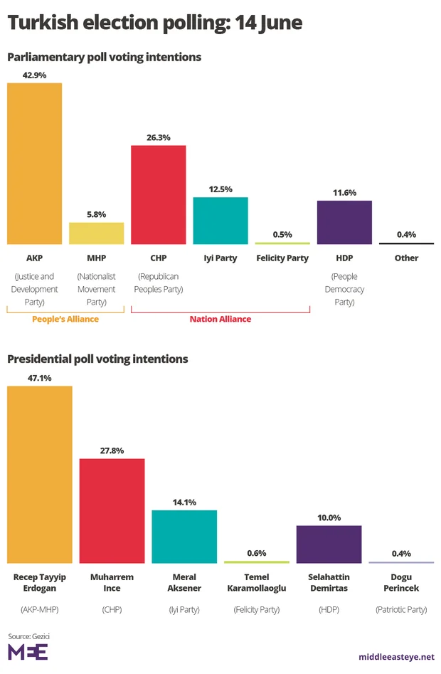 However, the latest polls indicate Erdogan may not get the majority he needs to maintain power in the initial vote and a second presidential ballot could take place two weeks later. There are also indications the AKP may not win a majority in parliament.