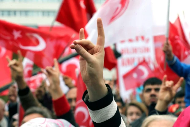 Supporters of the Turkish Nationalist Movement Party make a 'Grey Wolf' sign and wave MHP flags (AFP)
