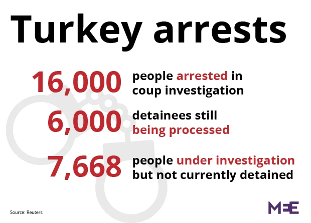 According to the state-run Anadolu Agency, 6,000 further detainees were still being processed while another 7,668 people were under investigation but were not currently detained.