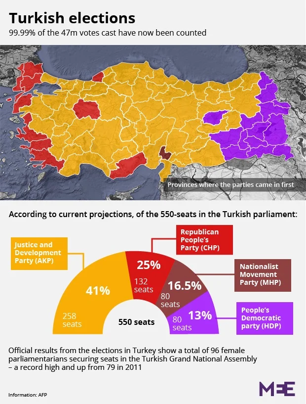 This is the first time that the AKP has not secured a majority in parliament since 2002, with the party winning 41 percent of the vote, which translates to 258 seats in the 550-seat parliament.