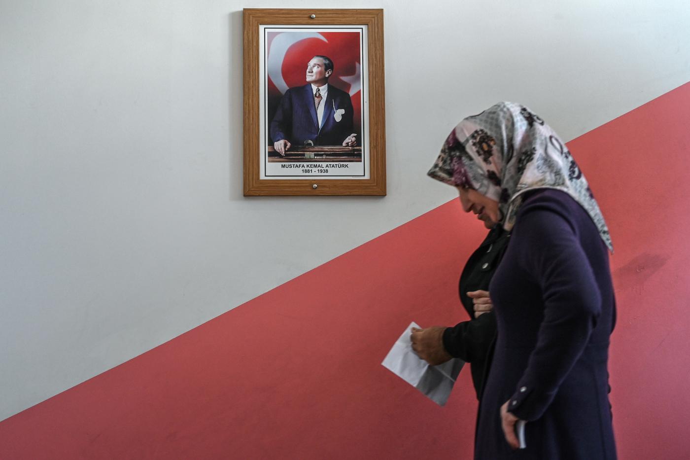 Two women walk past a portrait of Mustafa Kemal Ataturk, the founder of modern Turkey, as they go to cast their ballots in Istanbul (AFP)