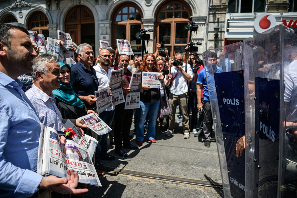 HDP MPs hold copies of a pro-Kurdish newspaper in a June 2016 protest over media censorship (AFP)