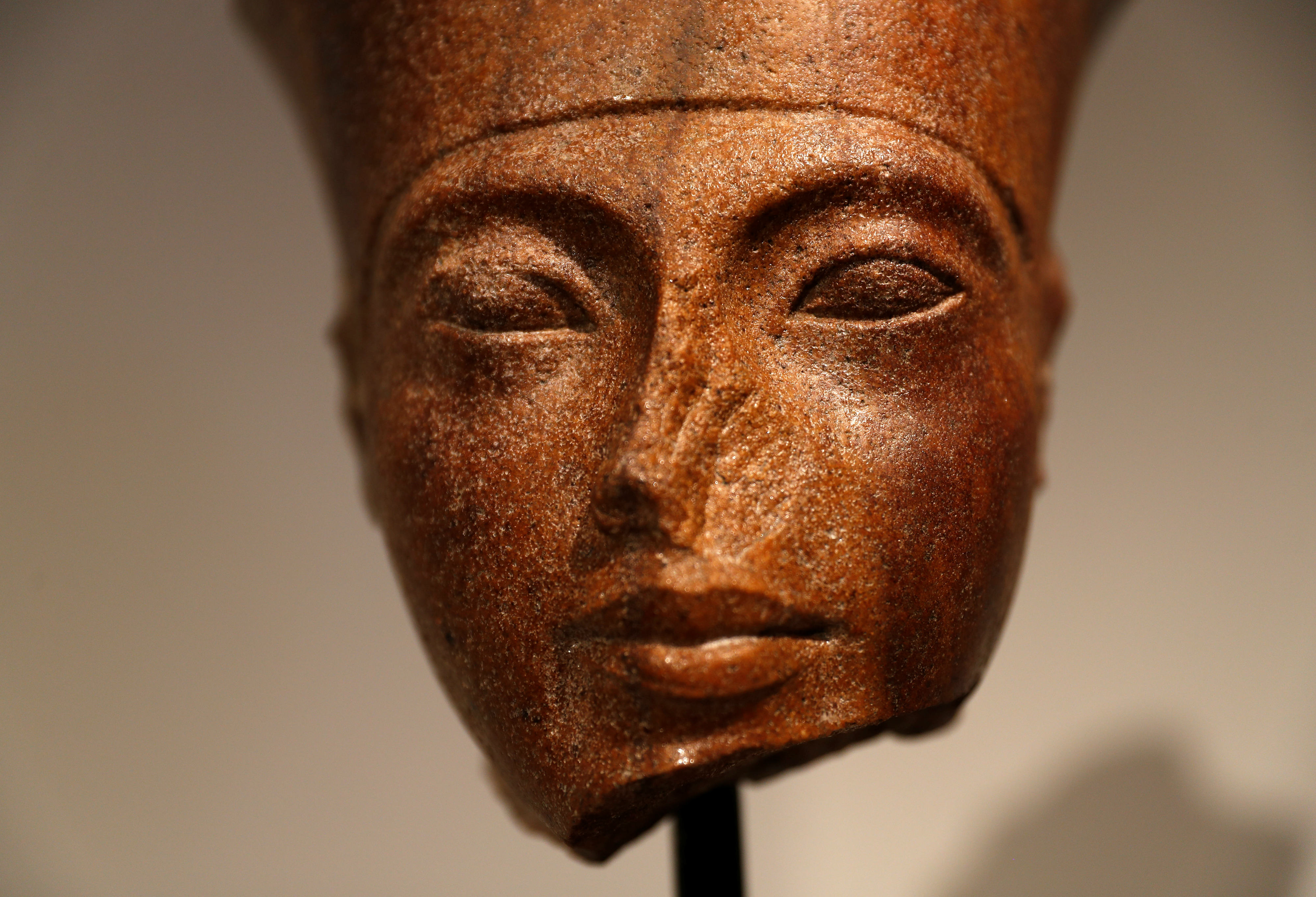 Egyptian brown quartzite head of God Amen is seen at Christie's auction house prior to its sale (Reuters)