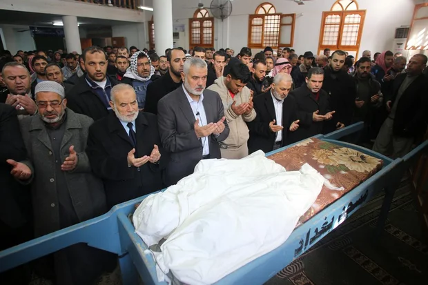 Senior Hamas leader Ismail Haniyeh (3rd L) attends the funeral of two young brothers from al-Hubail family, who died after fire broke out in their house in Gaza on 04 January, 2015 (AFP)