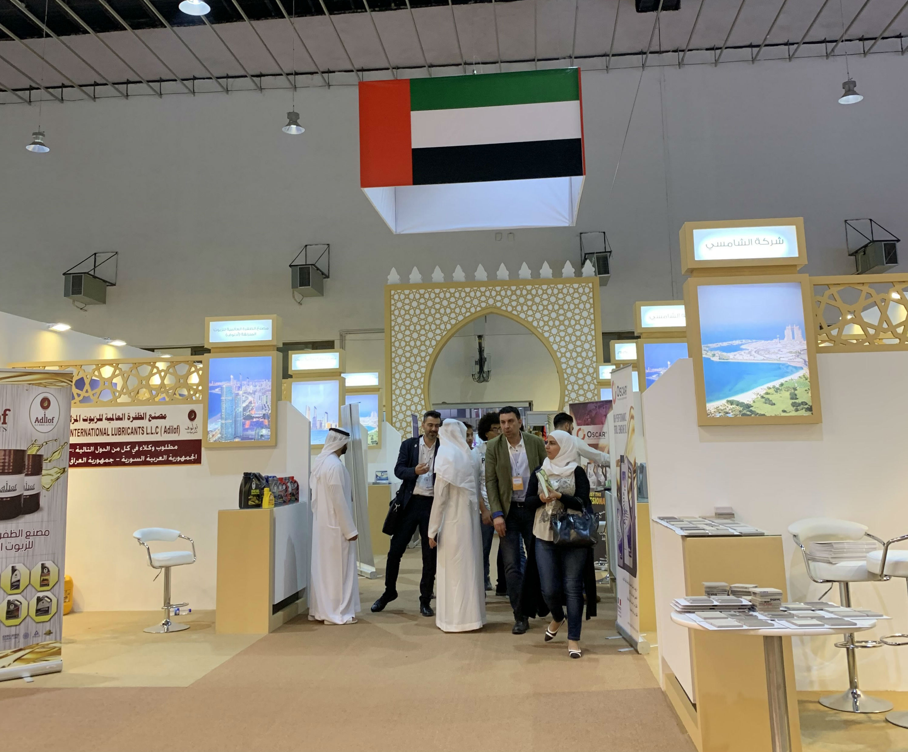 Around 15 companies are exhibiting there, represented by Emirati businessmen wearing traditional white thobes. The United Arab Emirates' flag is perched prominently above.