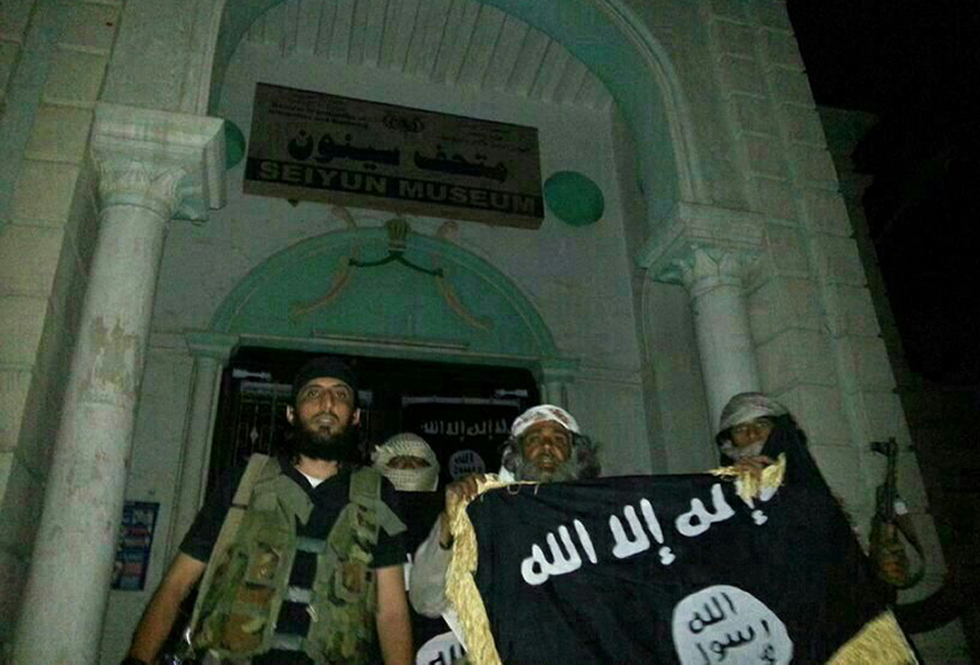 Al-Qaeda militants posing in the Yemeni city of Seiyun in Hadramawt province on 21 May 2014 (AFP)