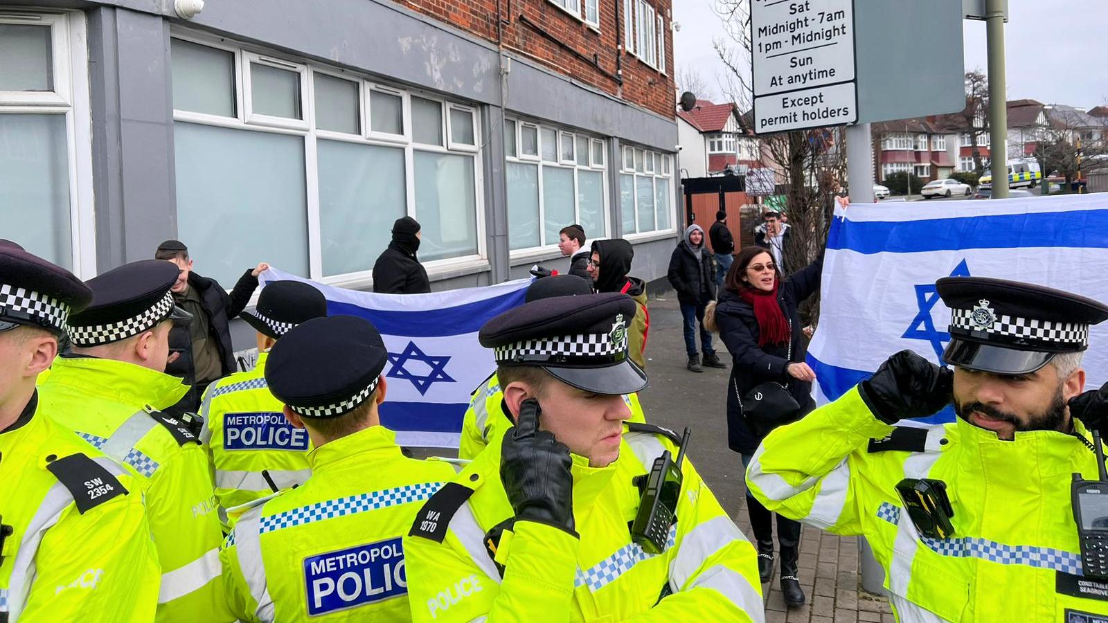 Wednesday’s event prompted noisy scenes in the street outside the Boys Clubhouse building as pro-Palestine and pro-Israel activists confronted each other, watched by about a dozen police officers.