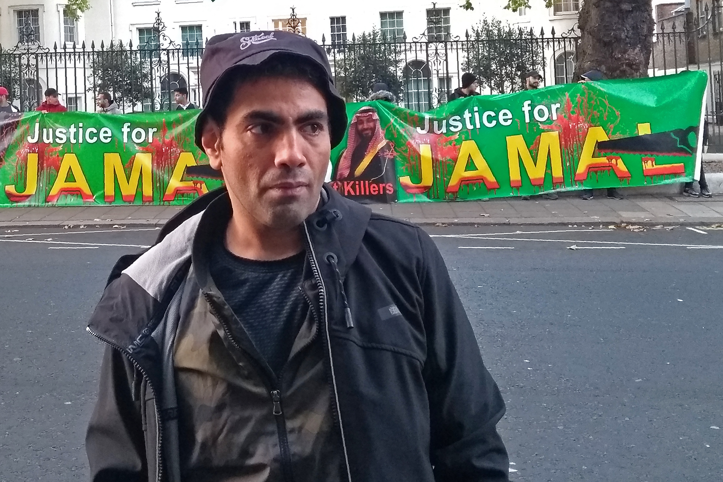 Al-Masarir outside the Saudi Arabian embassy in London in October 2018 calling for justice for Jamal Khashoggi (AFP)