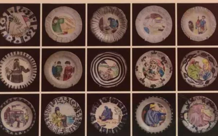 They depict Palestinians carrying a water jar, baking, catching fish with a net, and harvesting olives. Three of the 21 plates show the Palestinian flag, with one atop what appears to be an Israeli military watchtower. Another, which is only partially visible, flies from the Dome of the Rock mosque in occupied East Jerusalem.