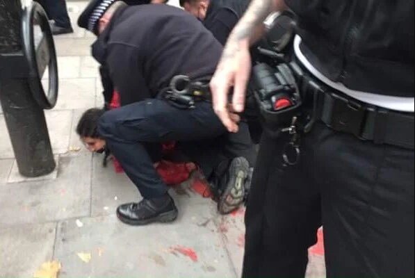 Huda Ammori being arrested outside Elbit Systems UK's London offices last weekend (Screengrab)