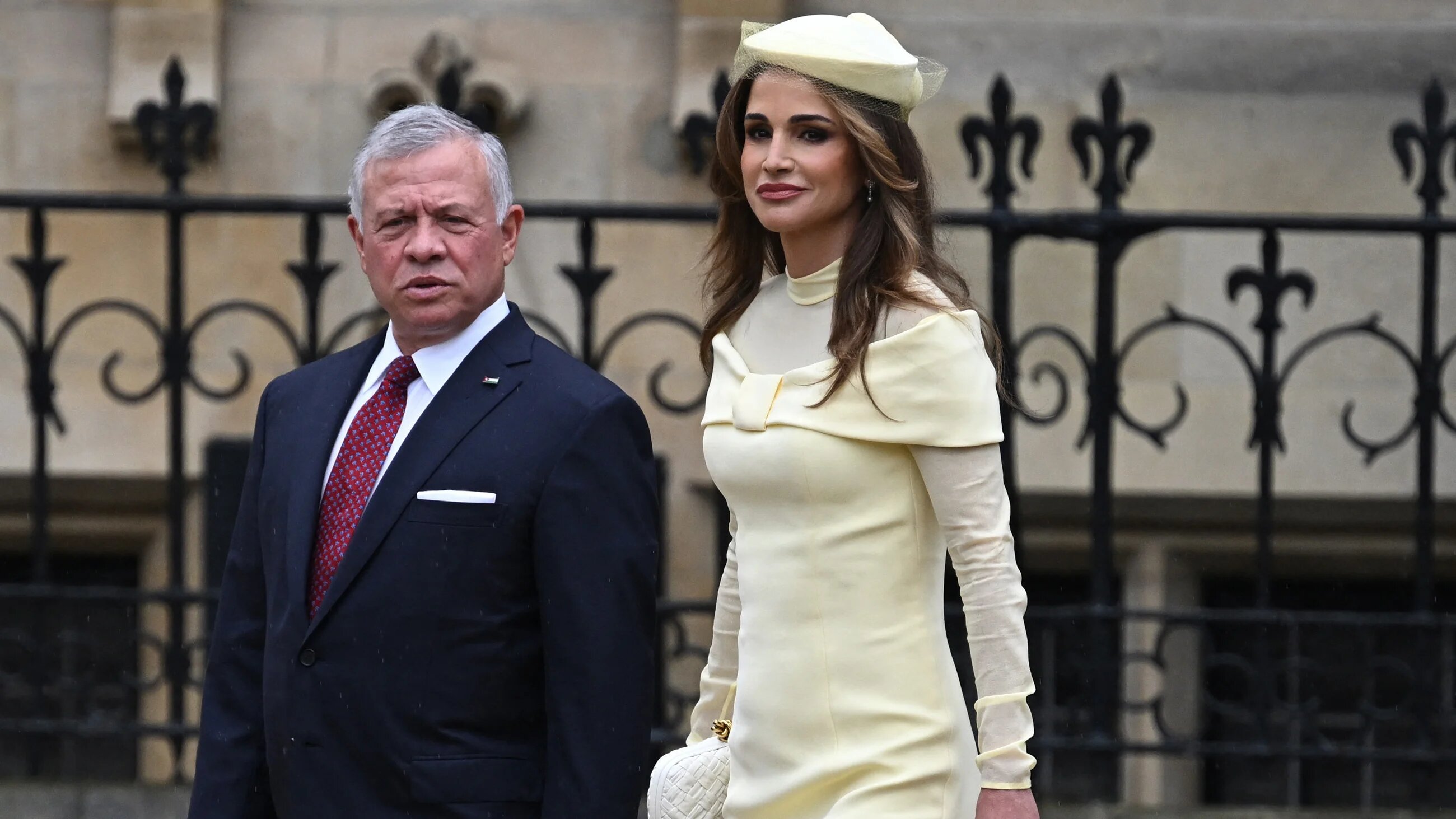 Jordan's King Abdullah II and Queen Rania arrive at Westminster Abbey ahead of the coronations of Britain's King Charles III, 6 May 2023 (AFP)