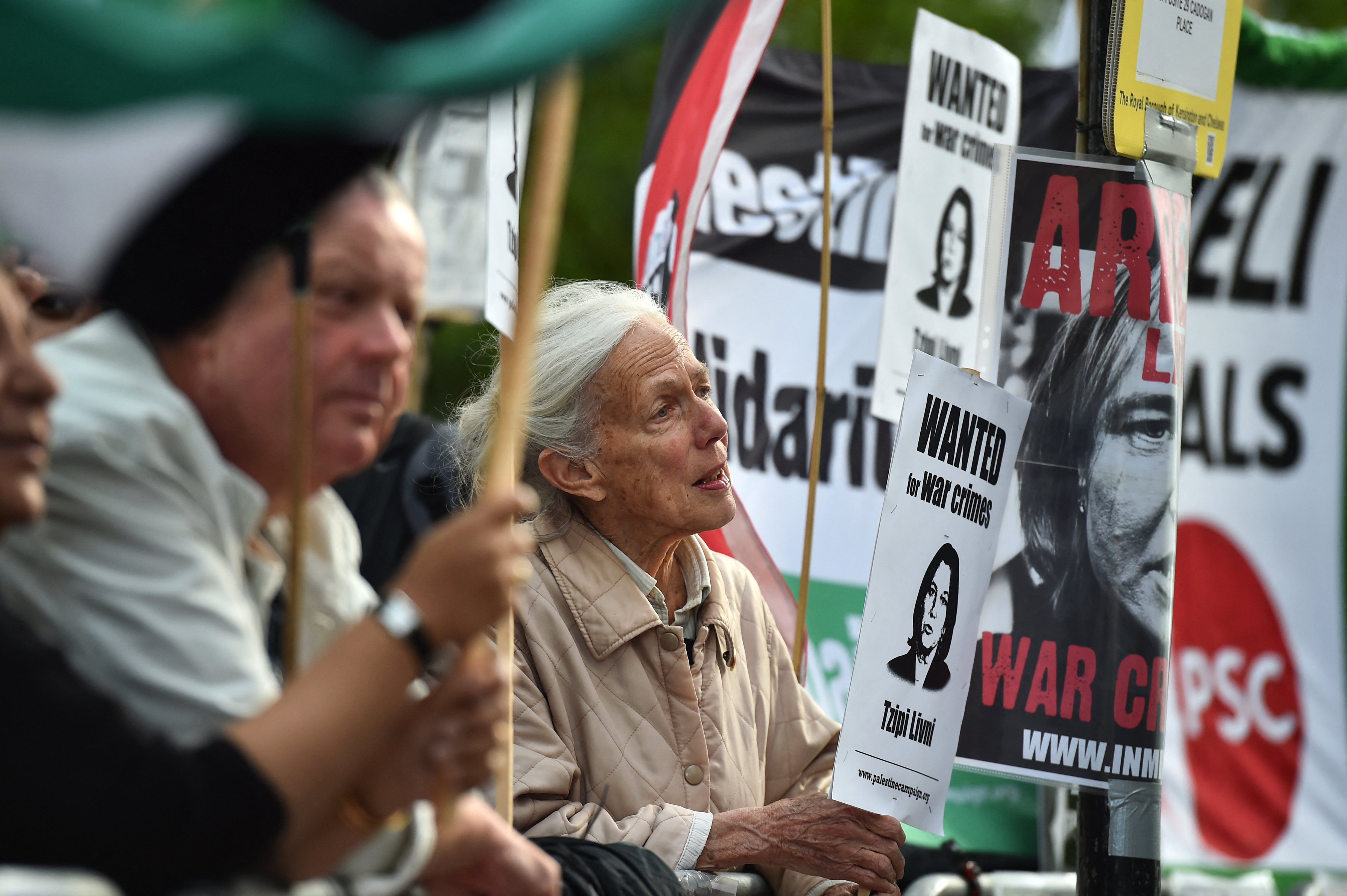 Supporters of the Palestine Solidarity Campaign hold placards bearing the picture of then-Israeli Justice Minister Tzipi Livni during a demonstration in central London on 15 May 2014 opposing her visit (AFP)