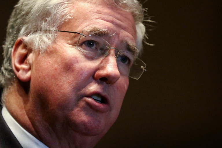 British Defence Secretary Michael Fallon speaks at news conference in Erbil, capital of Kurdish autonomous region in northern Iraq on Saturday (AFP)