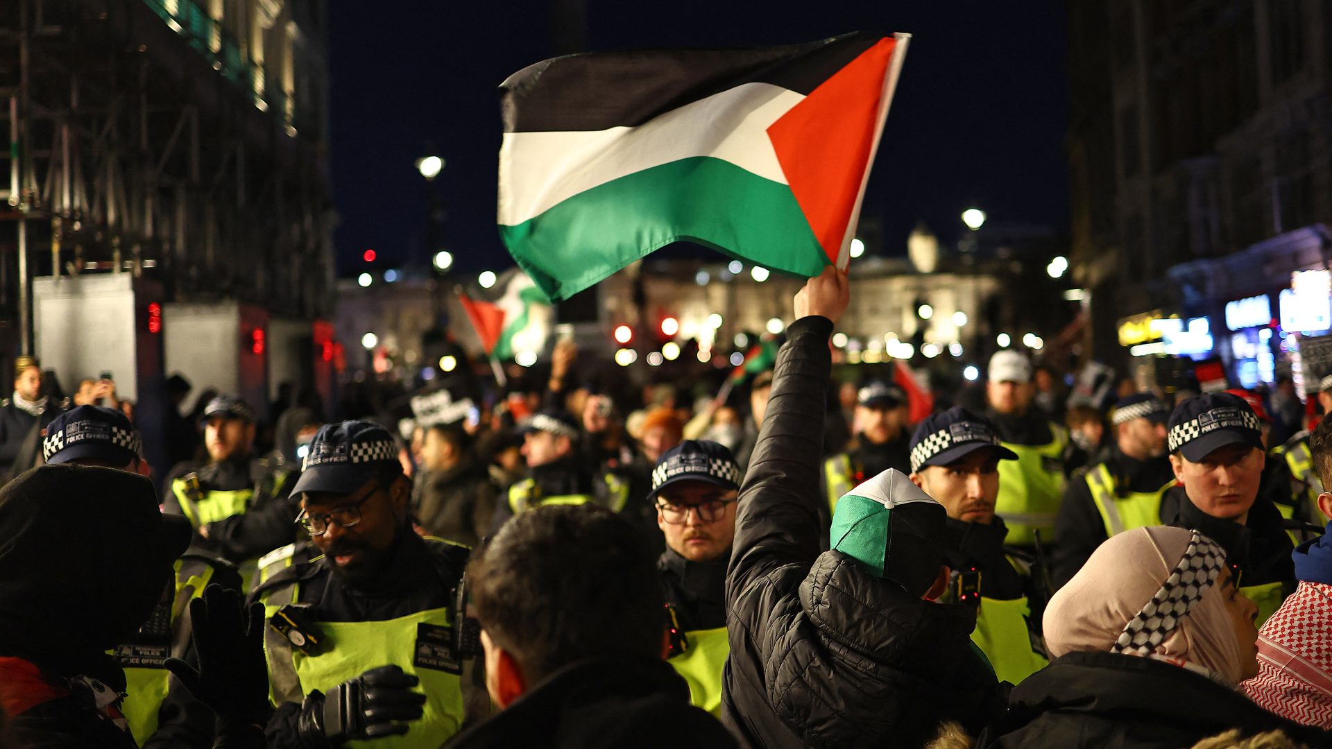 Police officers form a line in front of pro-Palestinian protesters in central London on 25 November 2023 (AFP)