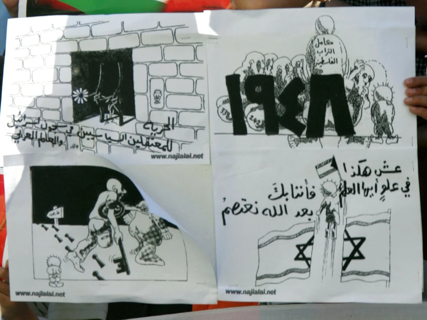 His most famous creation was Handala, a small spiky-haired dishevelled child, usually portrayed with his back to the reader, representing a witness to injustices and war.