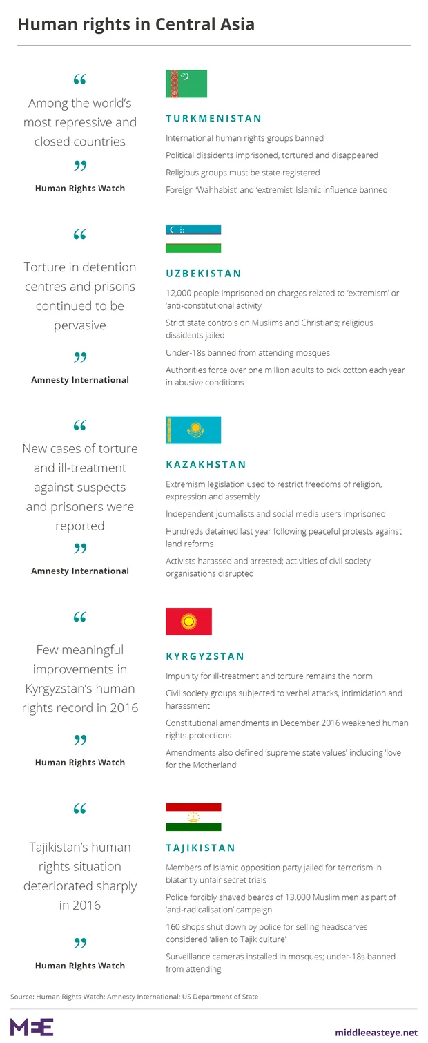 Human Rights Watch earlier this year described human rights protection as being "in crisis" in Central Asia, while Amnesty International said that "repression of dissent, critical opinion and political opposition" remained the norm across the region's former Soviet states.