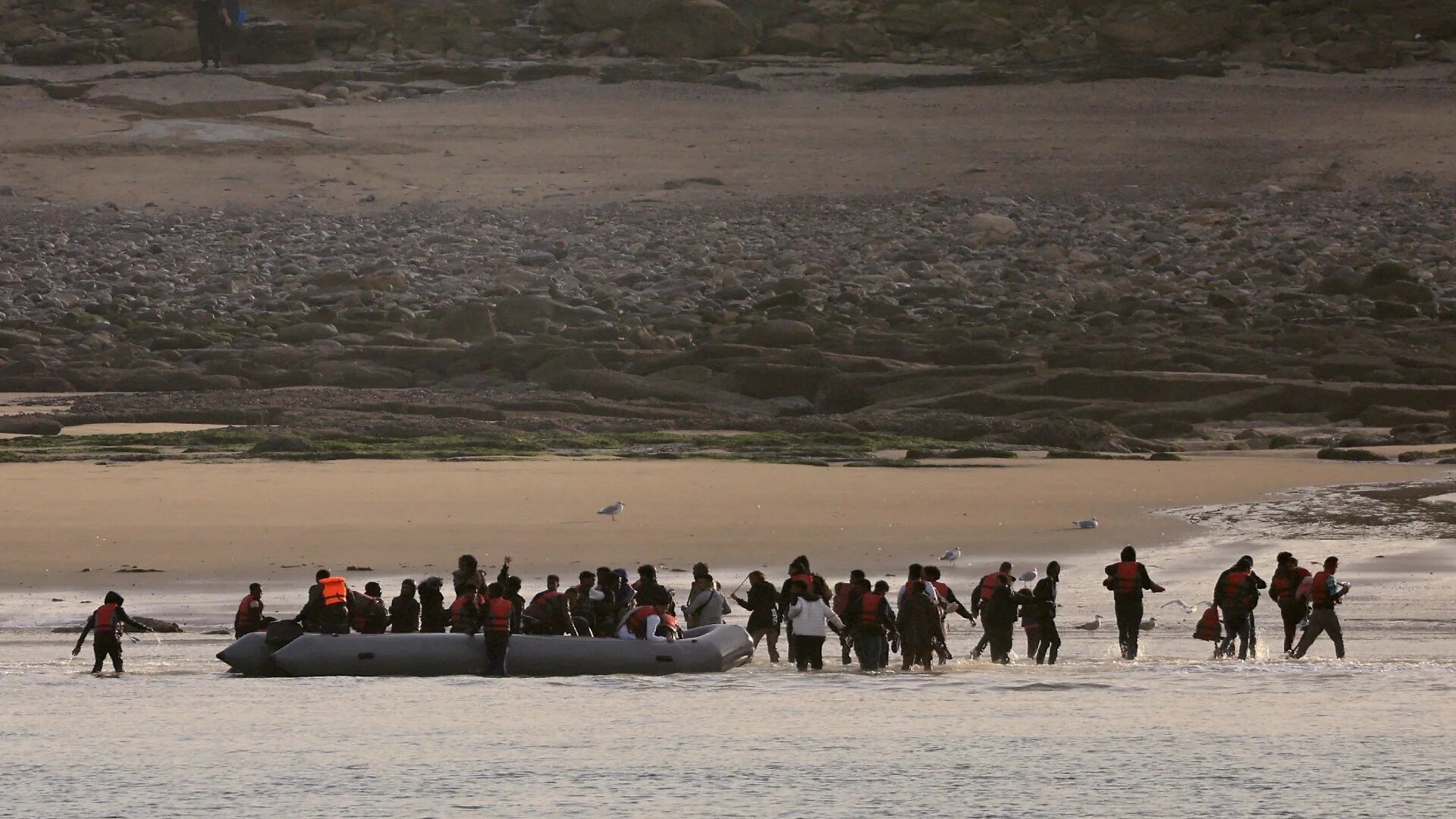 A group disembarks from a dinghy at Le Portel beach, near Boulogne, after an unsuccessful attempt to cross the Channel from France, 2 October 2023 (Reuters)