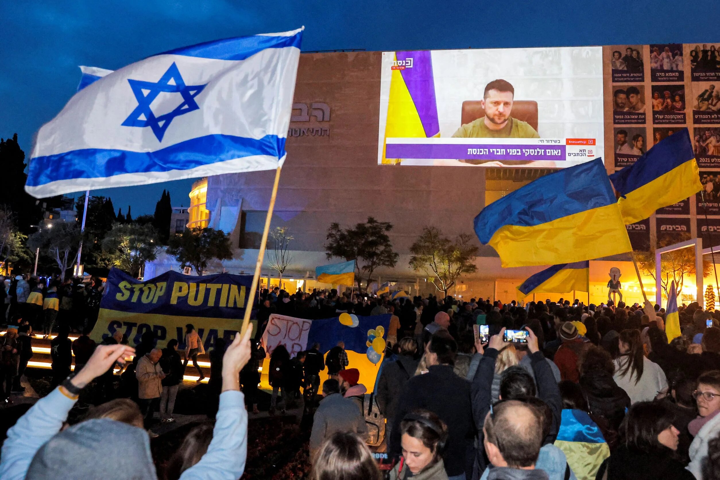 Demonstrators gather at Habima Square in Tel Aviv on 20 March to attend a televised video address by Ukraine's President Volodymyr Zelensky to the Israeli Knesset (AFP)