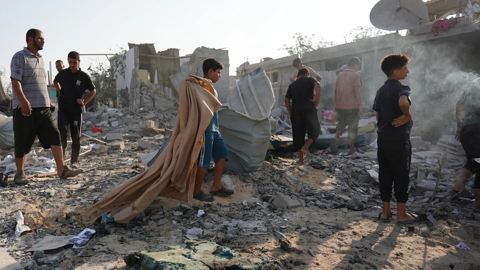 Palestinians inspect damage following Israeli bombardment on Khan Yunis in the southern Gaza Strip on 27 August 2024 (AFP/Bashar Taleb)