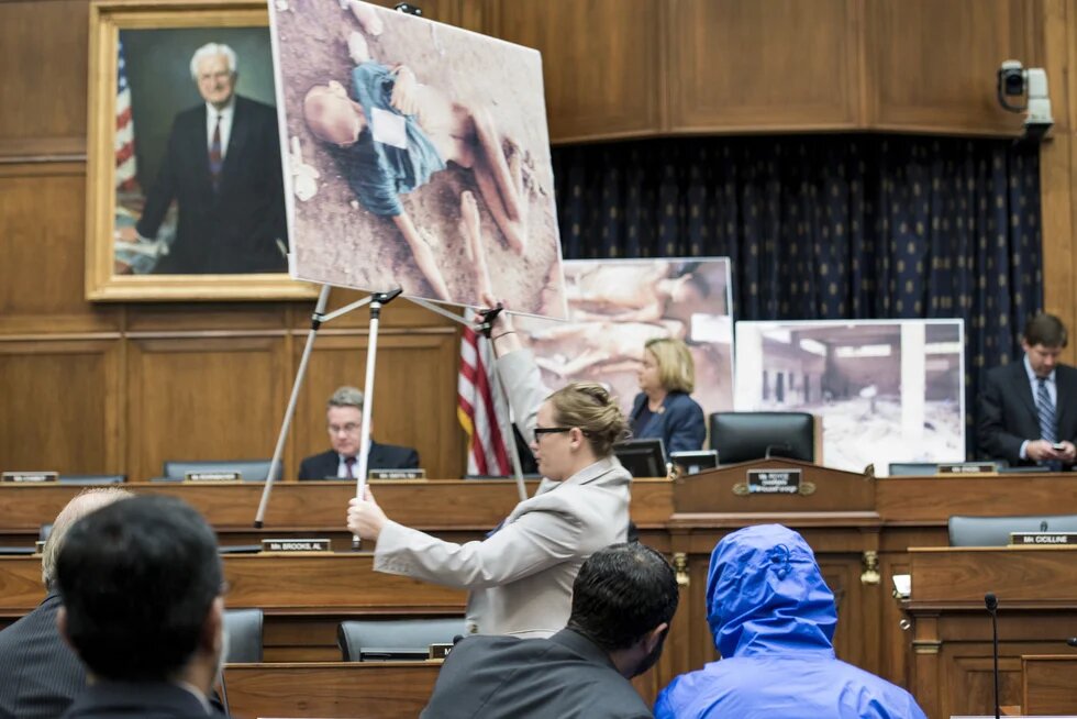 Images by former Syrian army photographer, codenamed Caesar (in blue mac), of prisoners tortured to death are shown in front of the US House Foreign Affairs Committee in 2014 (AFP)