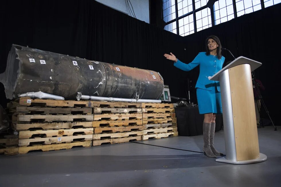 Speaking in front of the weapon fragments at the military hangar at Joint Base Anacostia-Bolling just outside of Washington, US Ambassador to the United Nations Nikki Haley said the evidence was the first step in a "push back" against the Islamic Republic's influence in the Middle East.