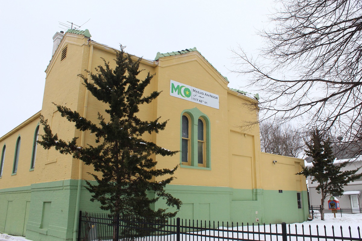 Even without a large dome and tall minaret - the distinctive architectural features of a mosque - its bright colours help it stand out in the neighbourhood where many snow-covered lawns have become a planting ground for presidential campaign yard signs.
