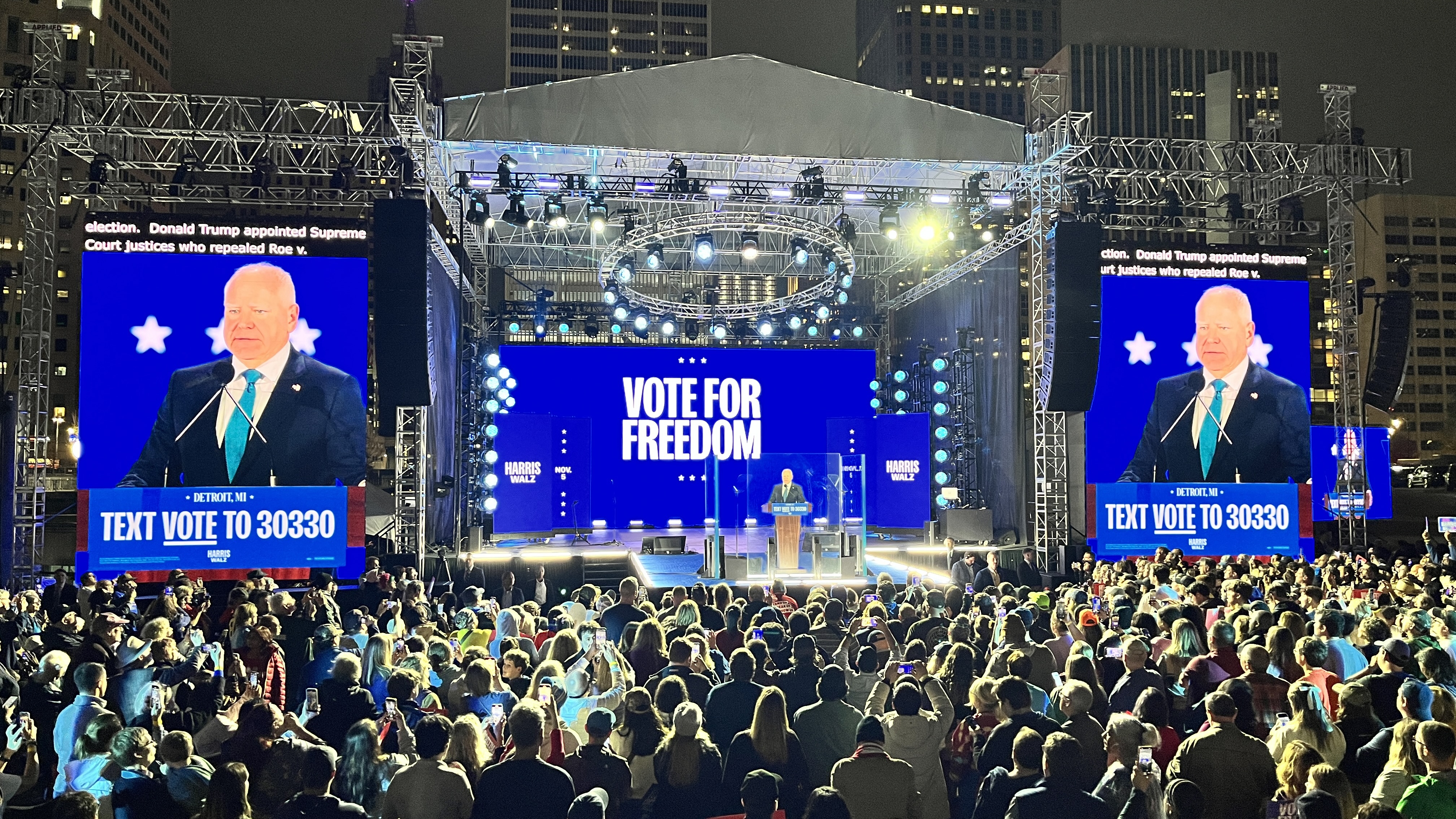 On Monday night, Democratic vice presidential candidate Tim Walz held his final campaign rally before election day, arriving after 1030pm local time at Detroit's Hart Plaza to deliver a five-minute address to a crowd of about two thousand people. They had been waiting since the doors opened five hours earlier.