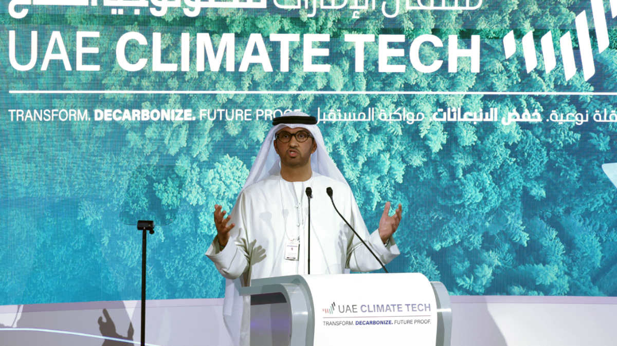 Sultan al-Jaber speaks during UAE Climate Tech conference in Abu Dhabi Energy centre, on 10 May 2023 (AFP)