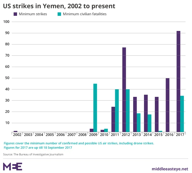 Yet the 38 strikes conducted in Yemen in 2016 in the last year of Obama's presidency are dwarfed in by the 90 carried out since Donald Trump became president at the start of 2017.