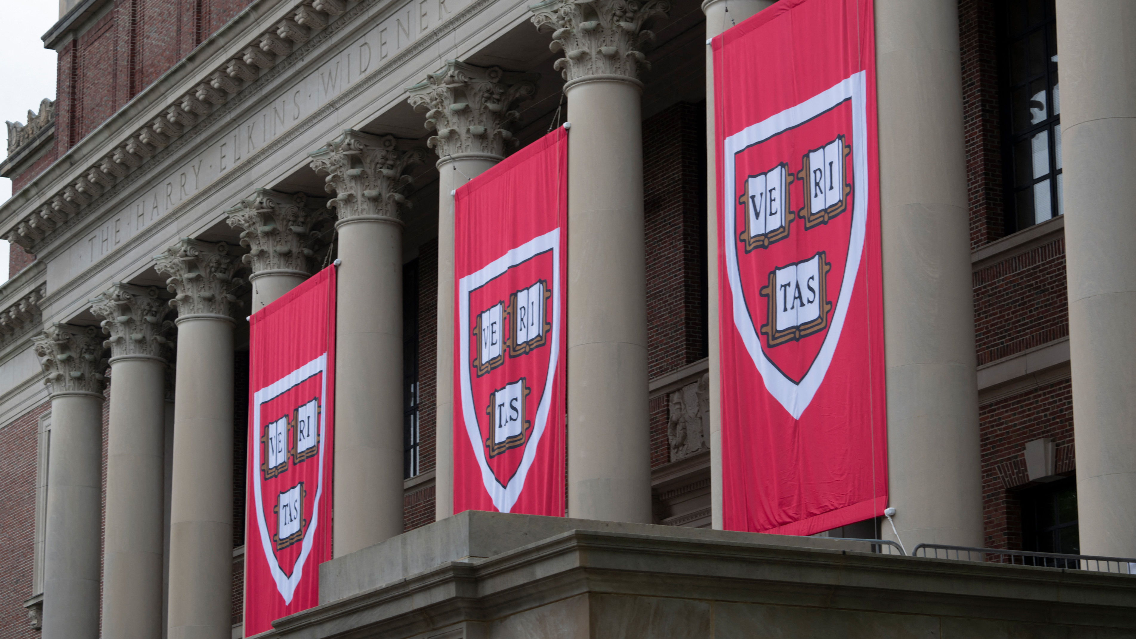 Harvard banners hang in front of Widener Library during the 374th Harvard Commencement in Harvard Yard in Cambridge, Massachusetts, on 29 May 2025 (Rick Friedman/AFP)