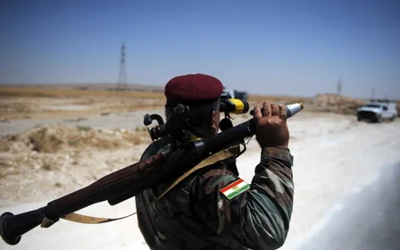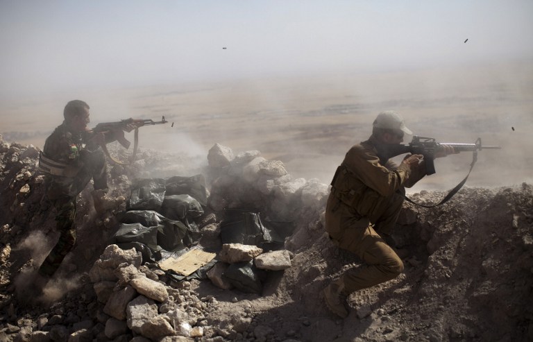 Iraqi Kurdish peshmerga fighters fire at IS militant positions east of Mosul on 9 September (AFP)