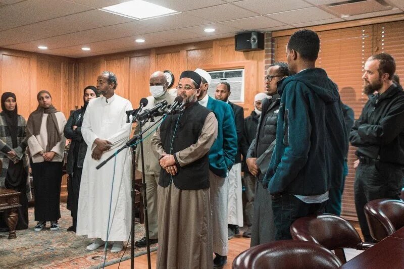 Members of the Muslim community hold a press conference at the Dar Al Farooq Center in Bloomington, Minnesota, over the sentencing of two mosque bombers on 12 April, 2022 (Courtesy)