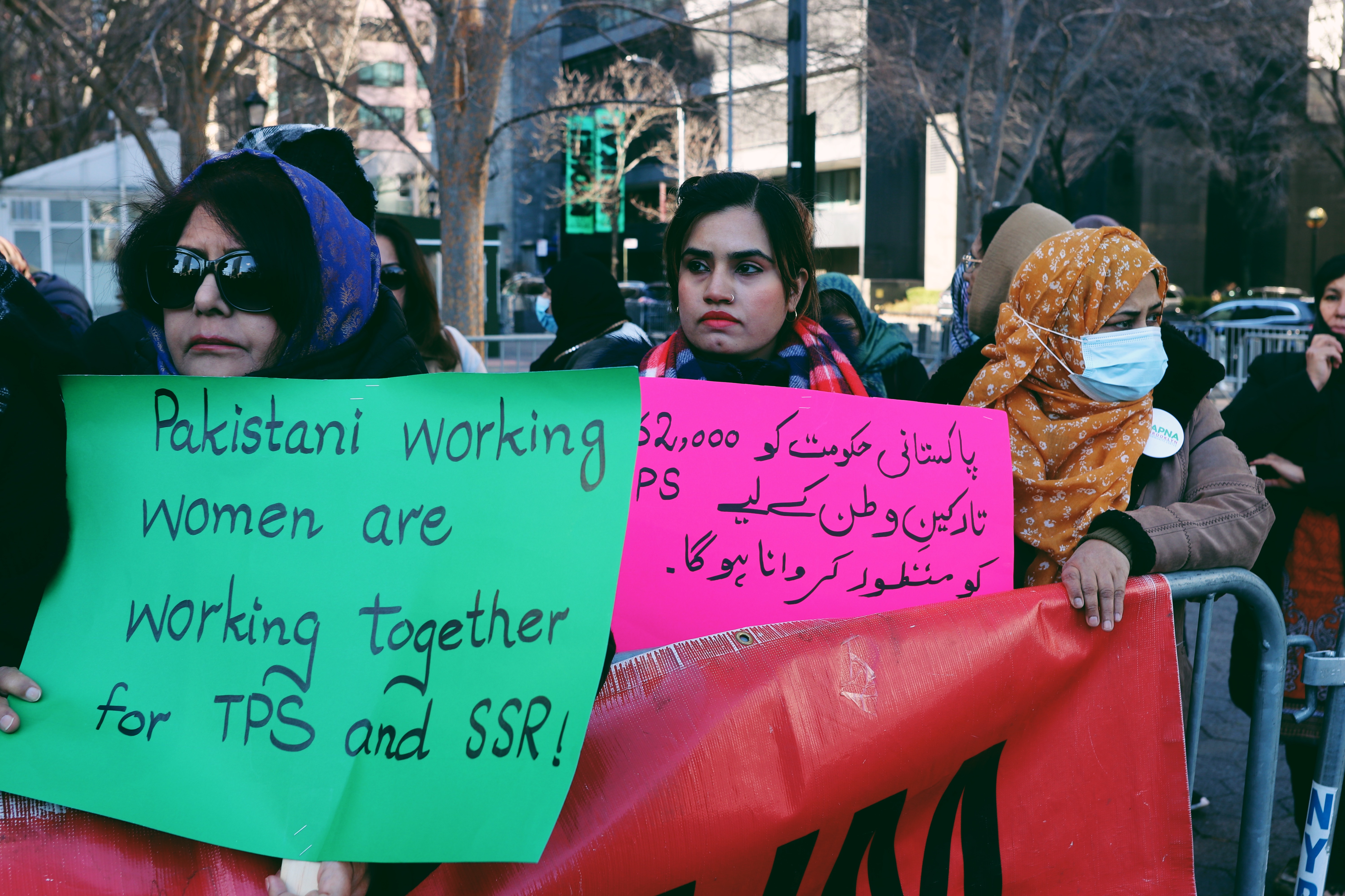 Women stood bracing the cold wind with their dupattas (shawls) and their shalwar kameez - ethnic clothing. They held signs both in English and Urdu demanding temporary protected status (TPS) for themselves and their loved ones.