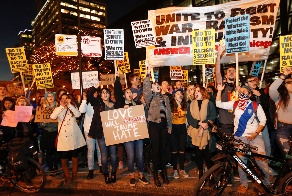 In Chicago, about 1,000 people attempted to gather outside the Trump International Hotel and Tower downtown while chanting phrases including, "No Trump! No KKK! No racist USA." Chicago police closed roads in the area, blocking the demonstrators' path.