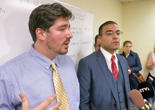 Hussam al-Roustom, a Syrian refugee resettled by Church World Service, speaks to reporters in Jersey City (MEE/James Reinl)