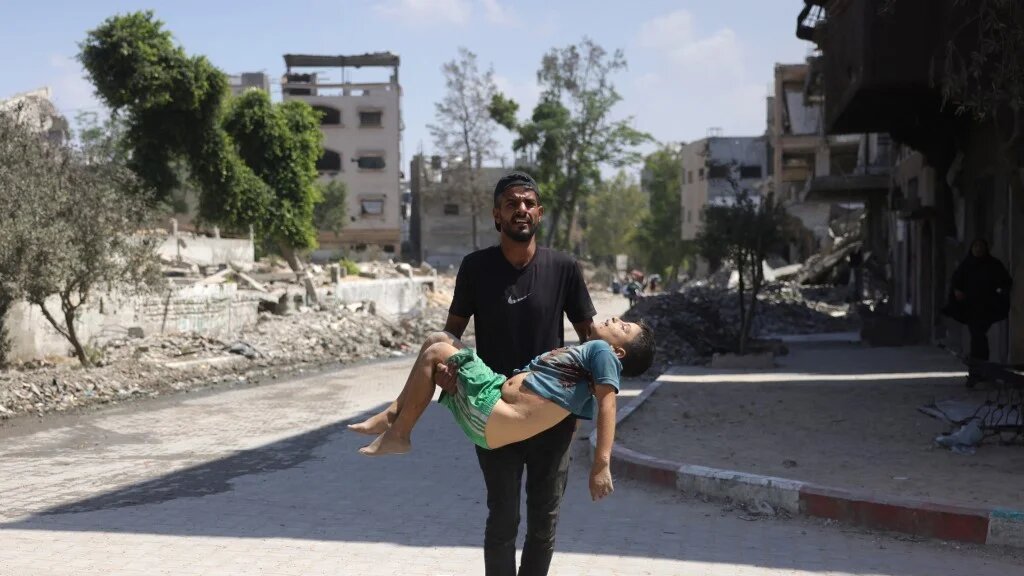 A man carries the body of a Palestinian boy, who was killed as he fled his home, in Jabalia's Saftawy neighbourhood on 26 August 2025 (Bashar Taleb/AFP)