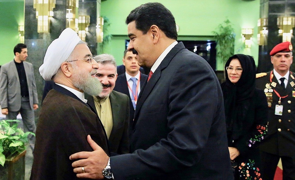Iranian President Hassan Rouhani,left, shakes hands with Venezuelan President Nicolas Maduro in Tehran on Saturday (AFP/Office of Iranian President Hassan Rouhani)