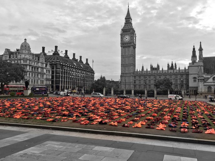 Around 2,500 life jackets, worn by refugees who have landed on the Greek island of Chios, were laid out in front of the British Parliament to protest growing anti-migrant sentiment, as well as to draw attention to the migrant and refugee crisis ahead of the UN Summit for Refugees and Migrants taking place in New York today.