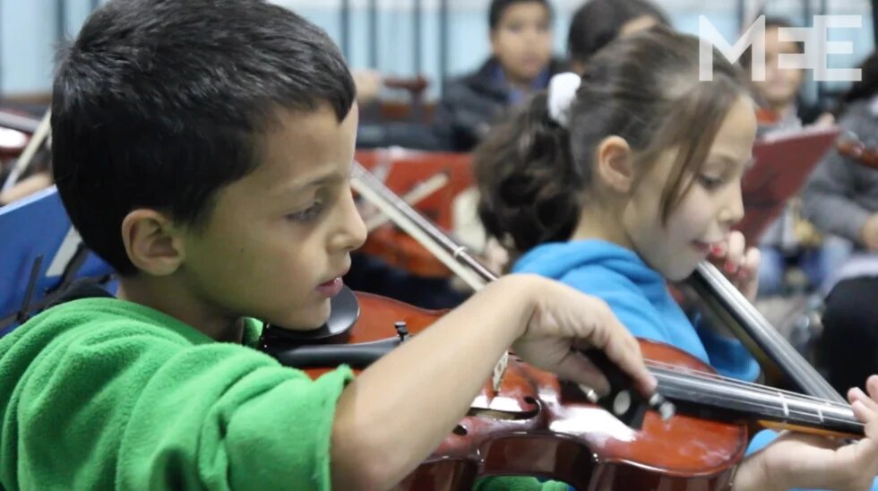 Disadvantaged children in Aida refugee camp use musical education as a creative outlet and distraction from the omnipresent signs of occupation