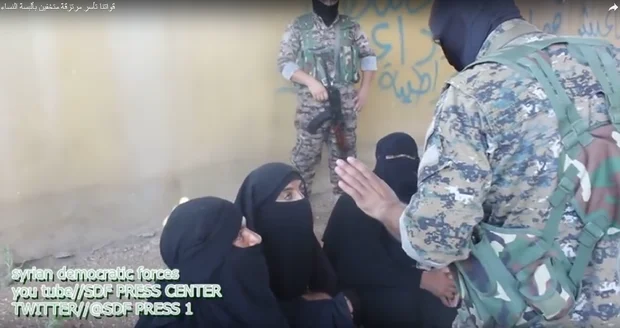 Syrian Democratic Forces video shows three men covered in veils after their attempt to flee the siege of Manbij in northeastern Syria