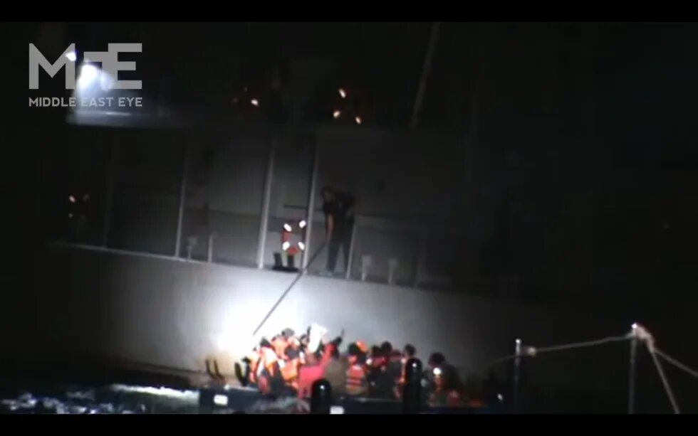 A video obtained by Middle East Eye on Friday appears to show a man dressed in the uniform typically worn by Greek coastguards piercing a rubber dinghy with a boat hook as the people on board, who include young children, raise their hands and shout for help.