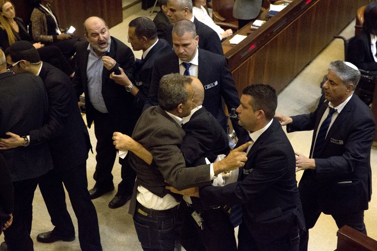 Before being ejected from the plenum - the chamber where MKs sit - 13 Palestinian MKs put up signs that said: "Jerusalem is the capital of Palestine."