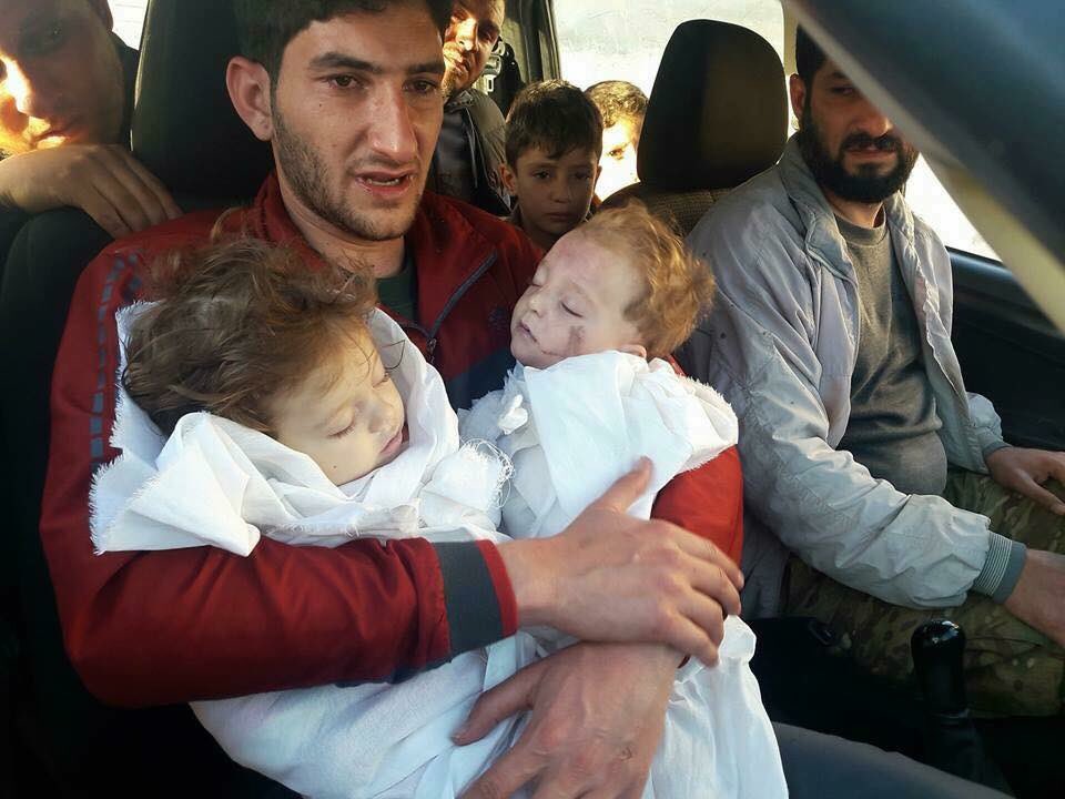 Abdulhamid al-Youssef carryies his twin children who were killed in the gas attack
