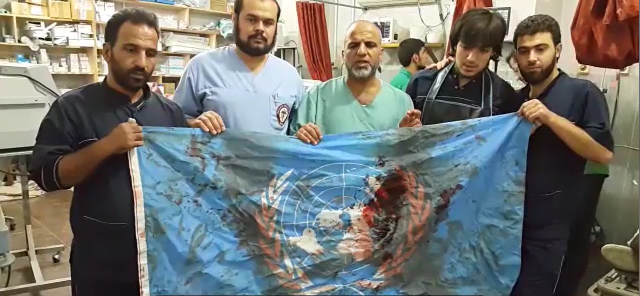 Doctors and nurses in Aleppo display blood-stained UN flag to highlight global inaction as death toll rises