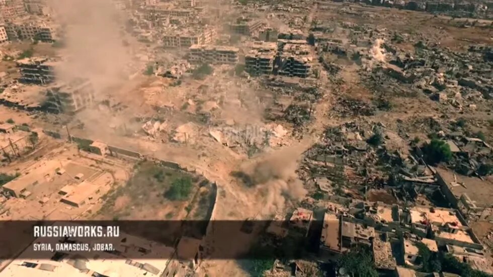 A Russian website has released a highly produced drone footage video showing the ongoing Syrian army offensive against a rebel stronghold in Jobar, an eastern district of Damascus.